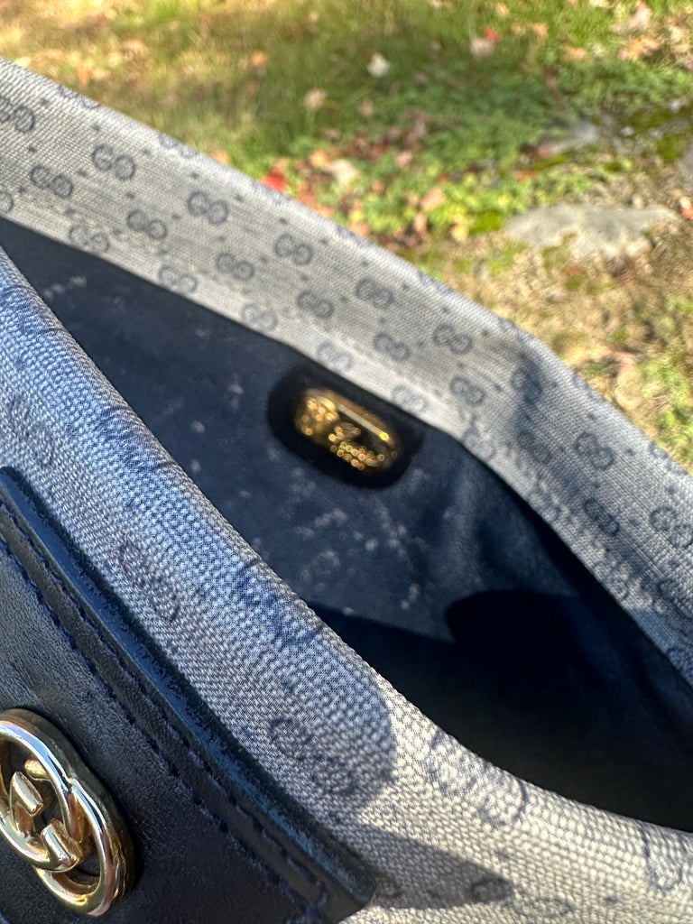 Authentic 80’s Gucci monogram purse in navy. Leather and monogram body in excellent condition. Some wear inside (minor scuffs). Some light wear to leather strap at base.